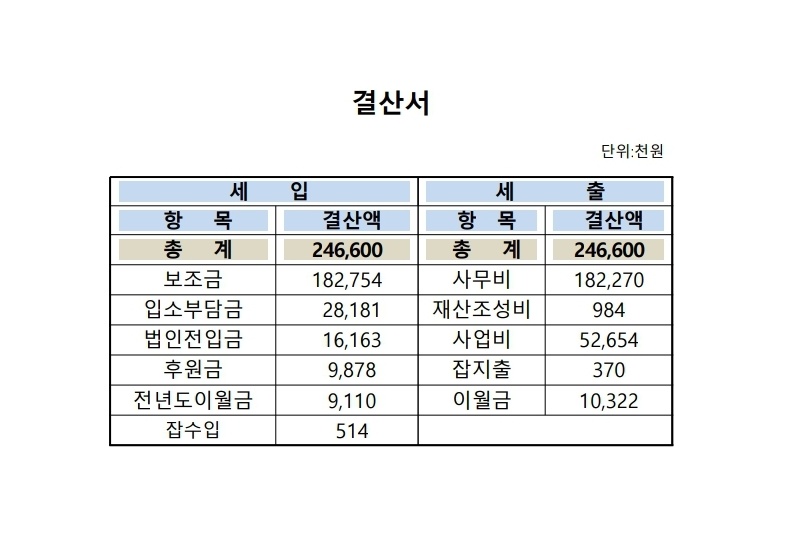 사회복지법인 재무⋅회계규칙 제20조에 의거하여 사)청소년문화공동체 십대지기 꿈터 2024년 결산을 다음과 같이 알려드립니다.